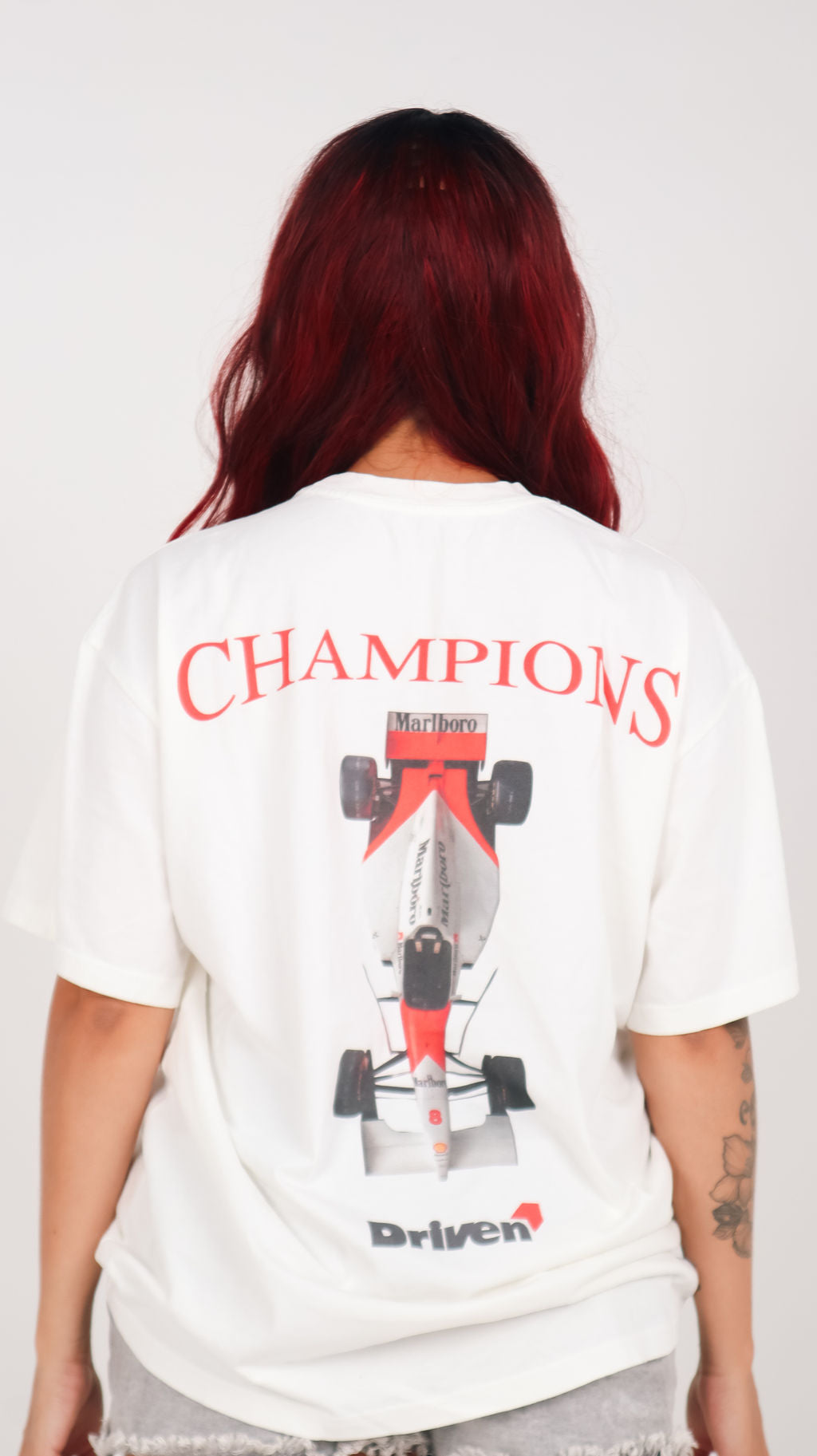 “CHAMPIONS” no es solo un título: es un guiño a la máquina que definió una era. Esta camiseta rinde homenaje al McLaren-Honda MP4/4 de finales de los 80, símbolo de precisión, velocidad y dominio absoluto en la pista. Confeccionada en algodón premium de 230 g/m², ofrece un tacto sólido y suave, un corte relajado con buena caída y un estampado trasero en alta definición que muestra la icónica librea rojo/blanco en vista superior.