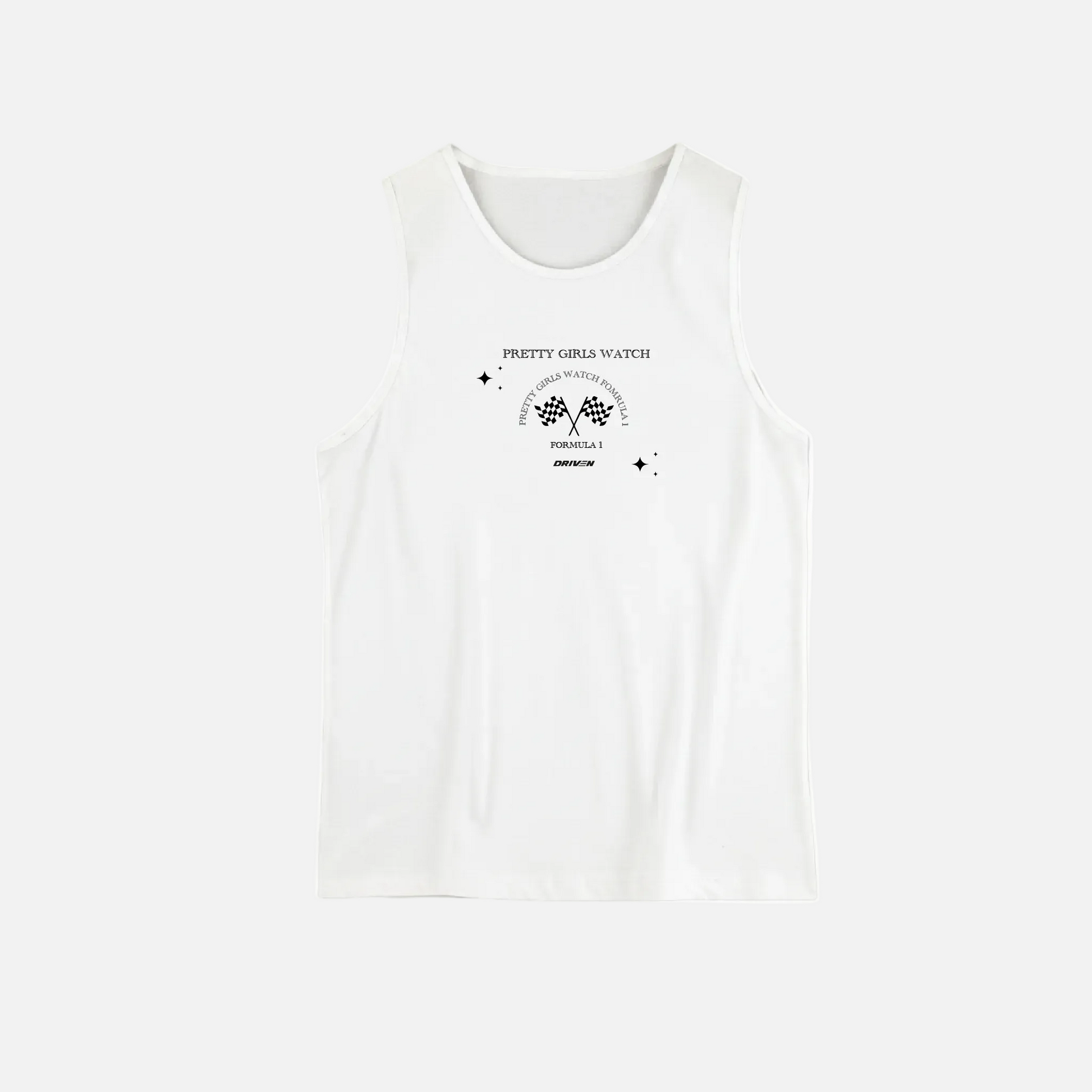 Eleva tu básico de verano con un toque de adrenalina. Nuestra tank top combina la simplicidad del blanco puro con un gráfico sutil inspirado en la Formula 1. Es la pieza perfecta para quienes buscan un look deportivo pero femenino y elegante.